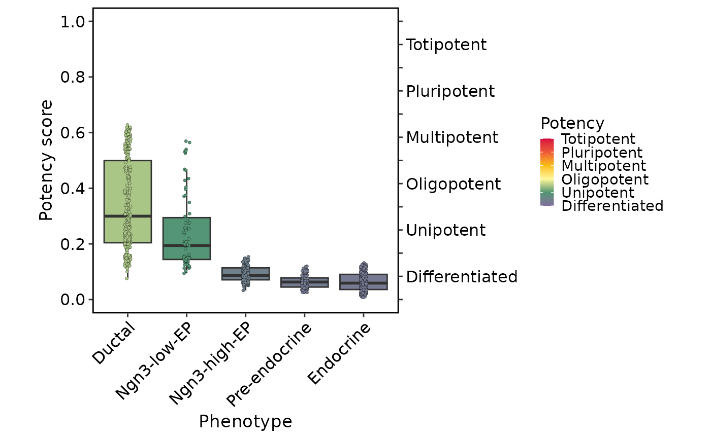 Score: UMAP plot colored by score computed by CytoTRACE2;Potency: UMAP plot colored by potency category computed by CytoTRACE2;Relative: UMAP plot colored by relative score computed by CytoTRACE2;Phenotype: UMAP plot colored by phenotype (ifgroup.byis provided);Boxplot: Boxplot of score computed by CytoTRACE2 corresponding to phenotype (ifgroup.byis provided).