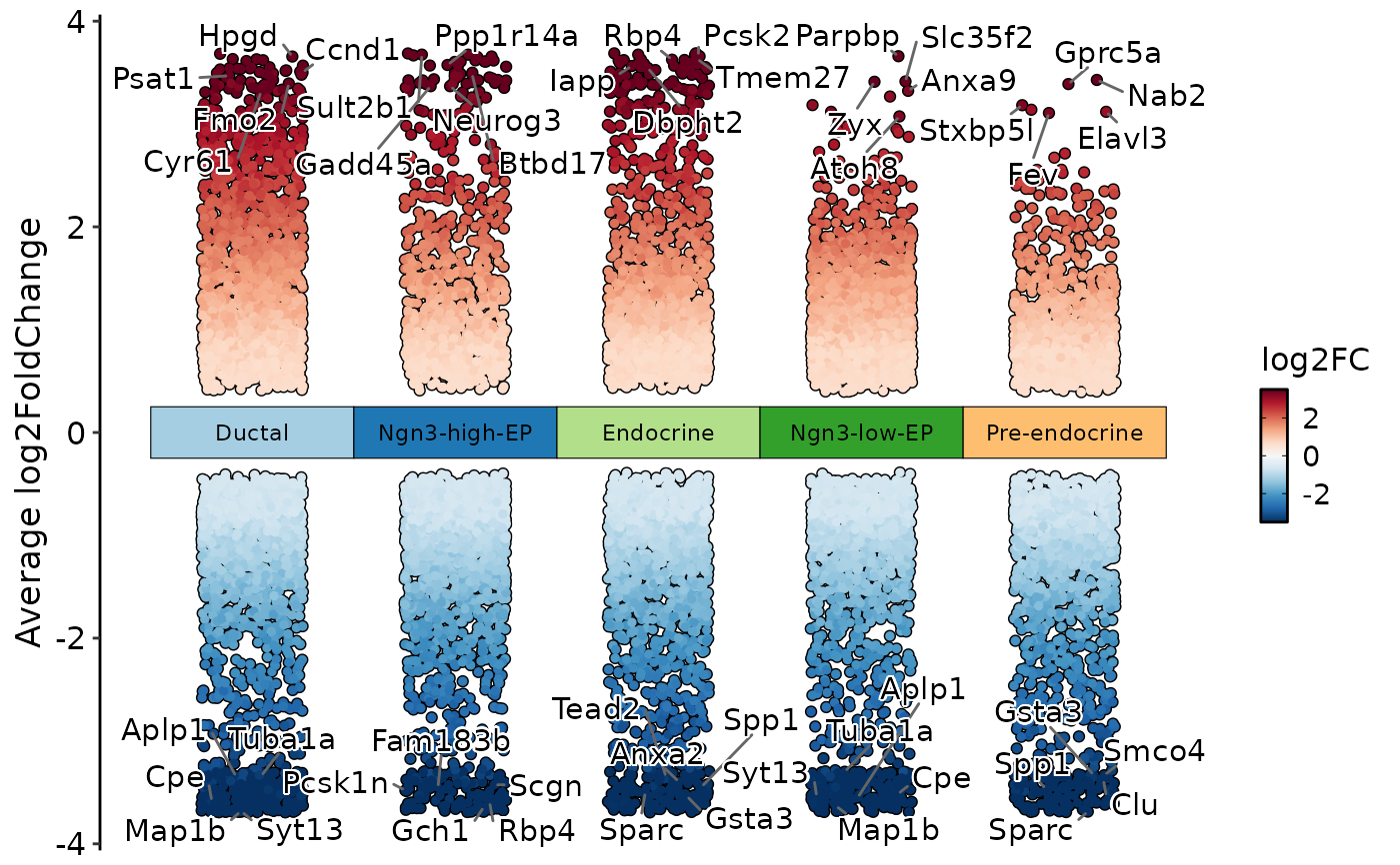 Draw a Manhattan-style plot of differential expression results by cell type.