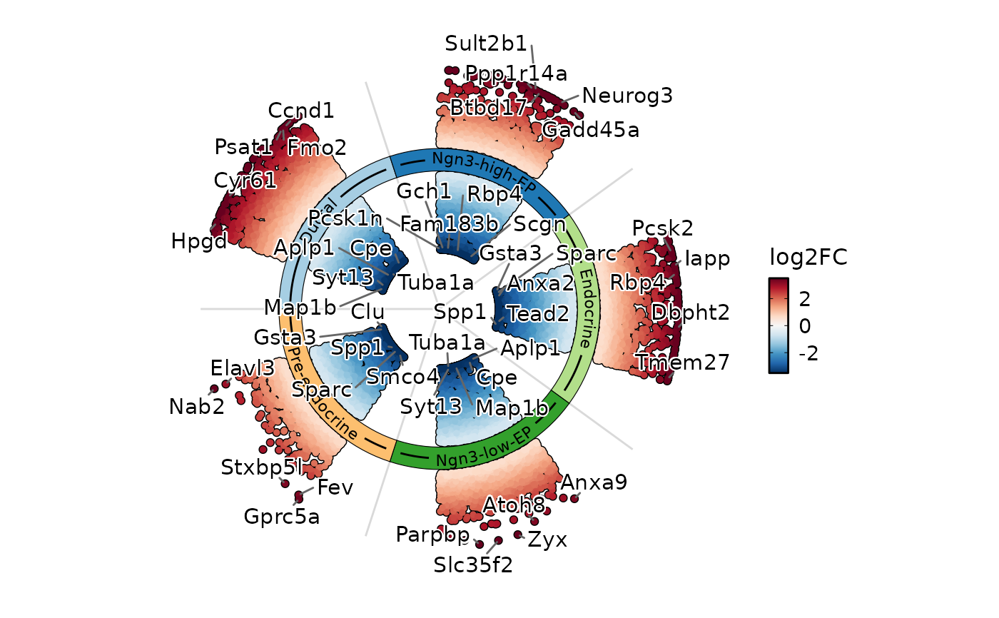 Draw a circular (ring) plot of differential expression results by cell type.