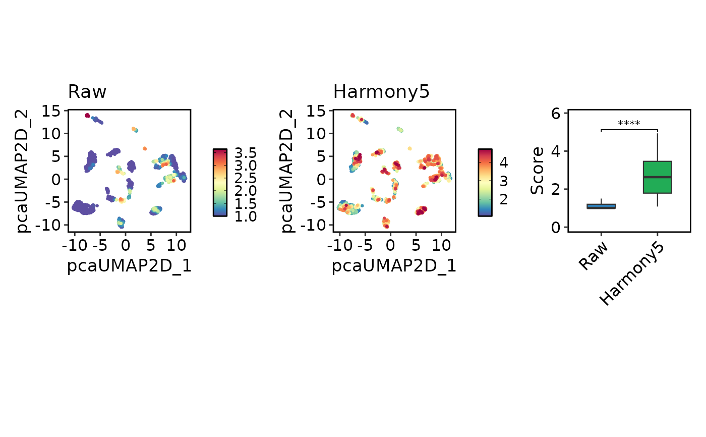 #> ✔ [2026-04-26 02:23:02] Stored LISI scores in metadata: "pcaUMAP2D_tech_LISI" and "Harmony5UMAP2D_tech_LISI"