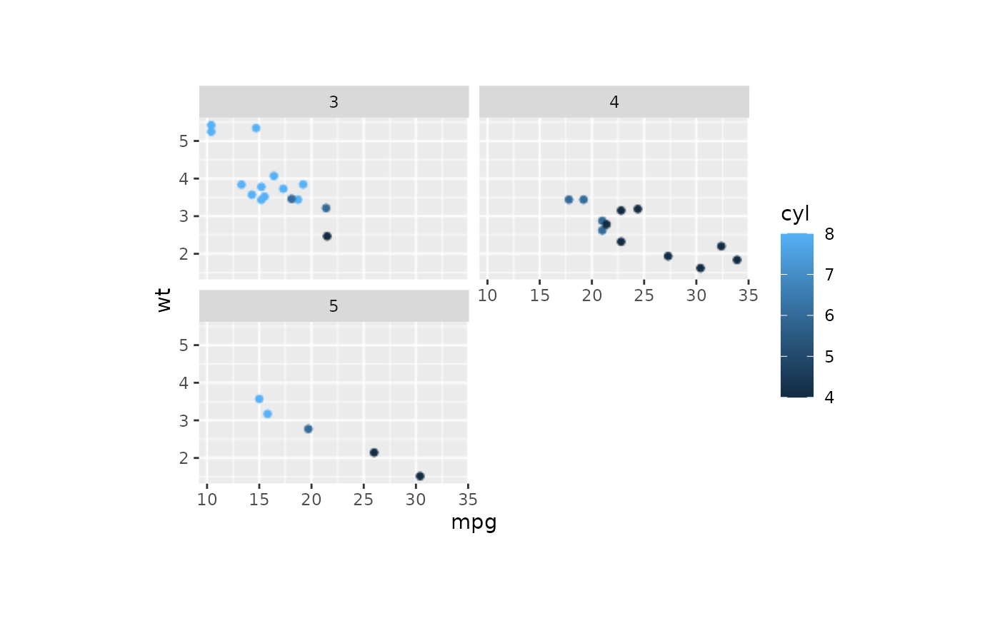 data = mtcars, aes(x = mpg, y = wt, colour = cyl)